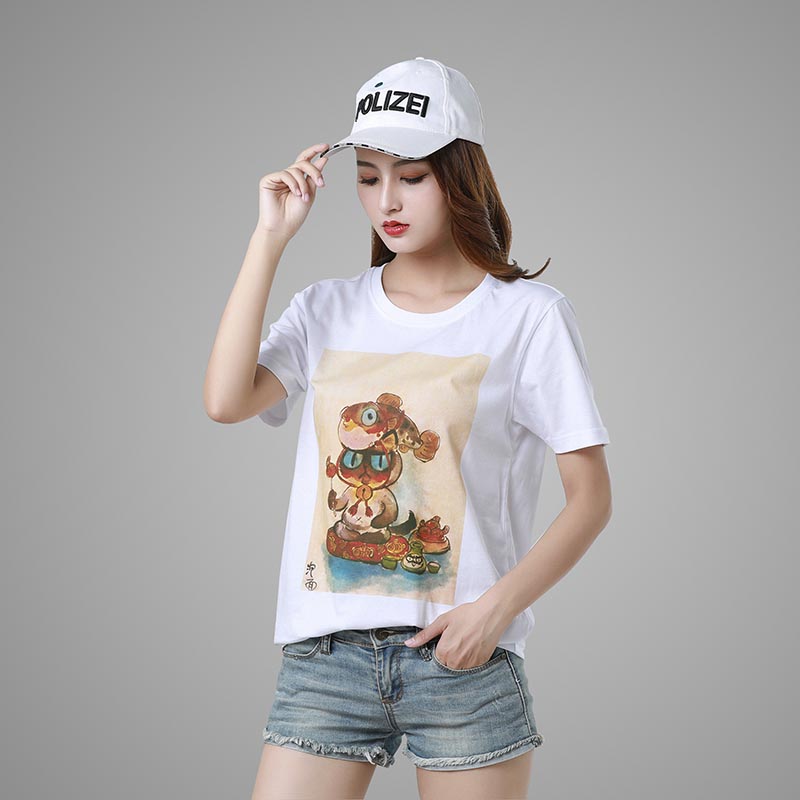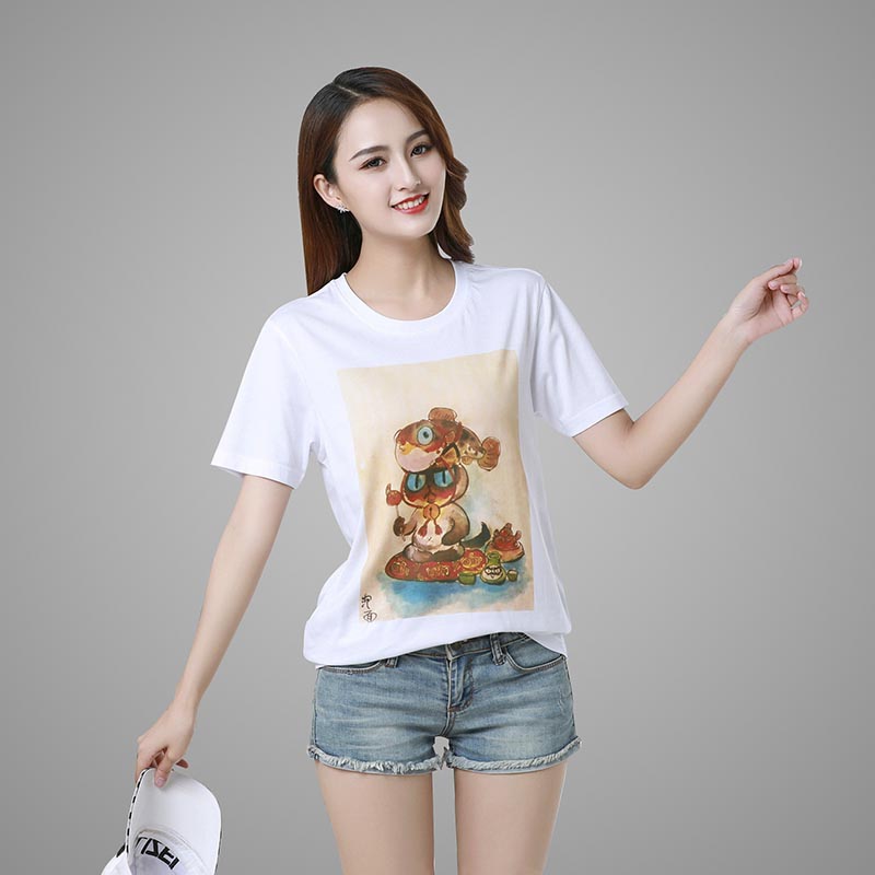 Cartoon Print White Round Neck Short-Sleeved T-Shirt Men and Women Couples Same Style